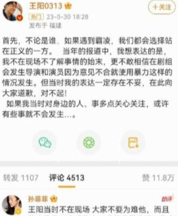 早前还有孙菲菲的事。2010年她拍戏被打,王阳一句“导演应该不会打演员”被剪出来传了十几年。其实他没在现场,也没参与调解,更没发过声明。孙菲菲2024年自己澄清过一次,说当时是请他帮忙说话,但他没理;2026年又发长文说他“设局利用她”。两段话对不上,王阳一条微博都没回。